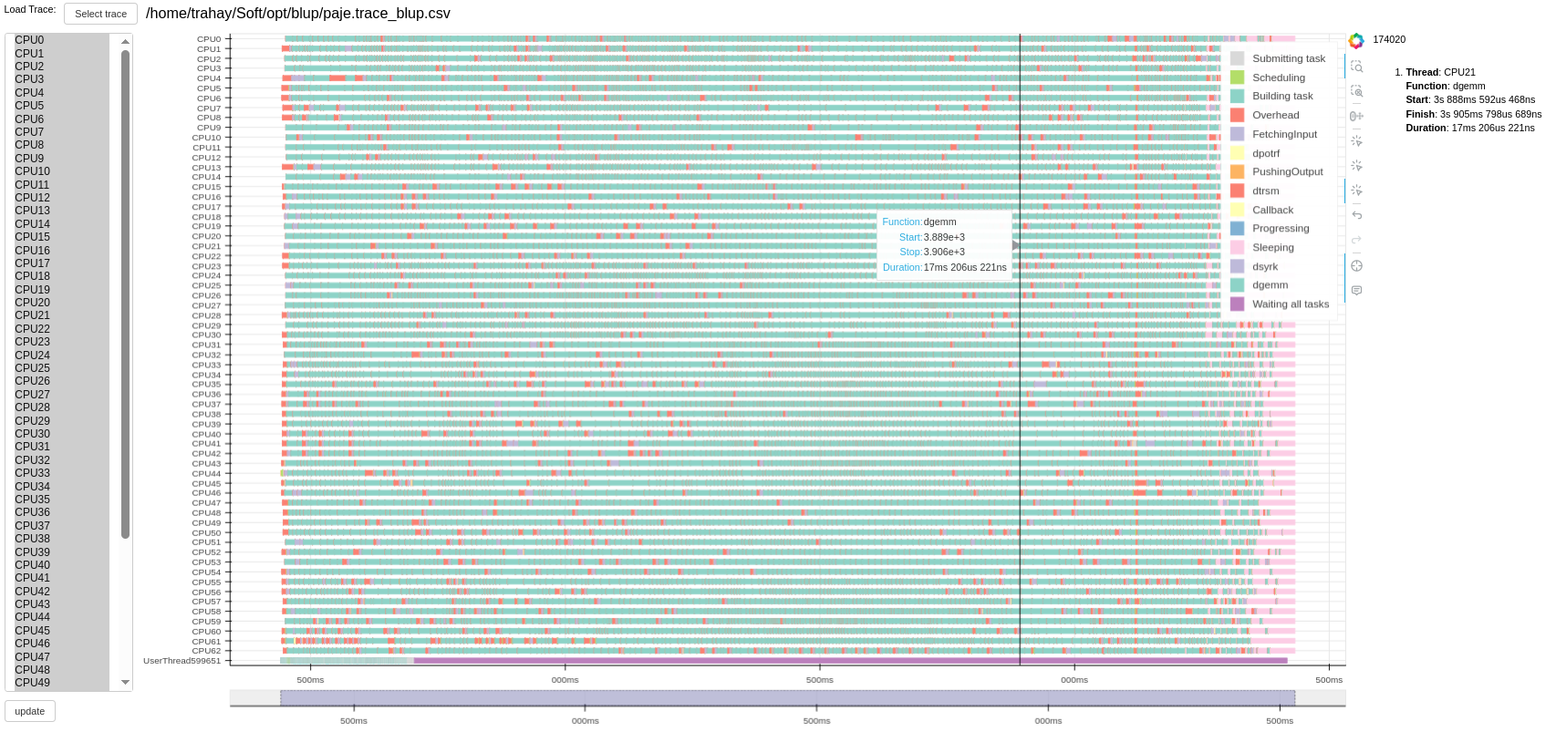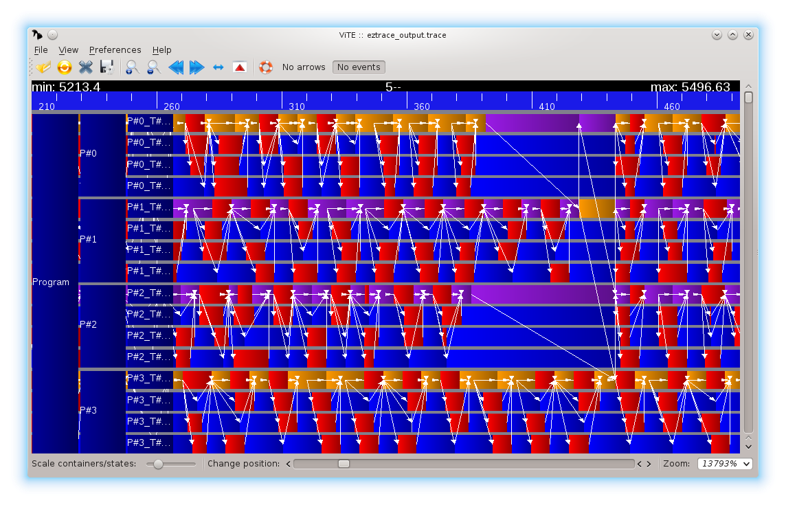 ViTE. If you want to understand your application performance, just run it with EZTrace and use the ViTE (Visual Trace Explorer) open source tool to visualize the program behavior.